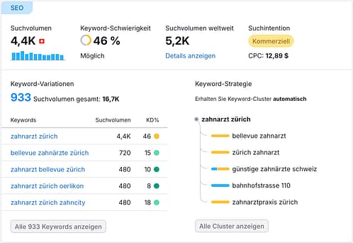 Wir identifizieren die Suchbegriffe, die wirklich Kunden bringen, z. B. "Zahnarzt Zürich Oerlikon", "Physiotherapie Bern" oder "Frauenarzt Luzern". Damit wissen wir genau, was und wo Ihre Zielgruppe sucht und wie wir Sie dort sichtbar machen. Wir konzentrieren uns auf die Suchbegriffe, die wirklich neue Termine bringen.